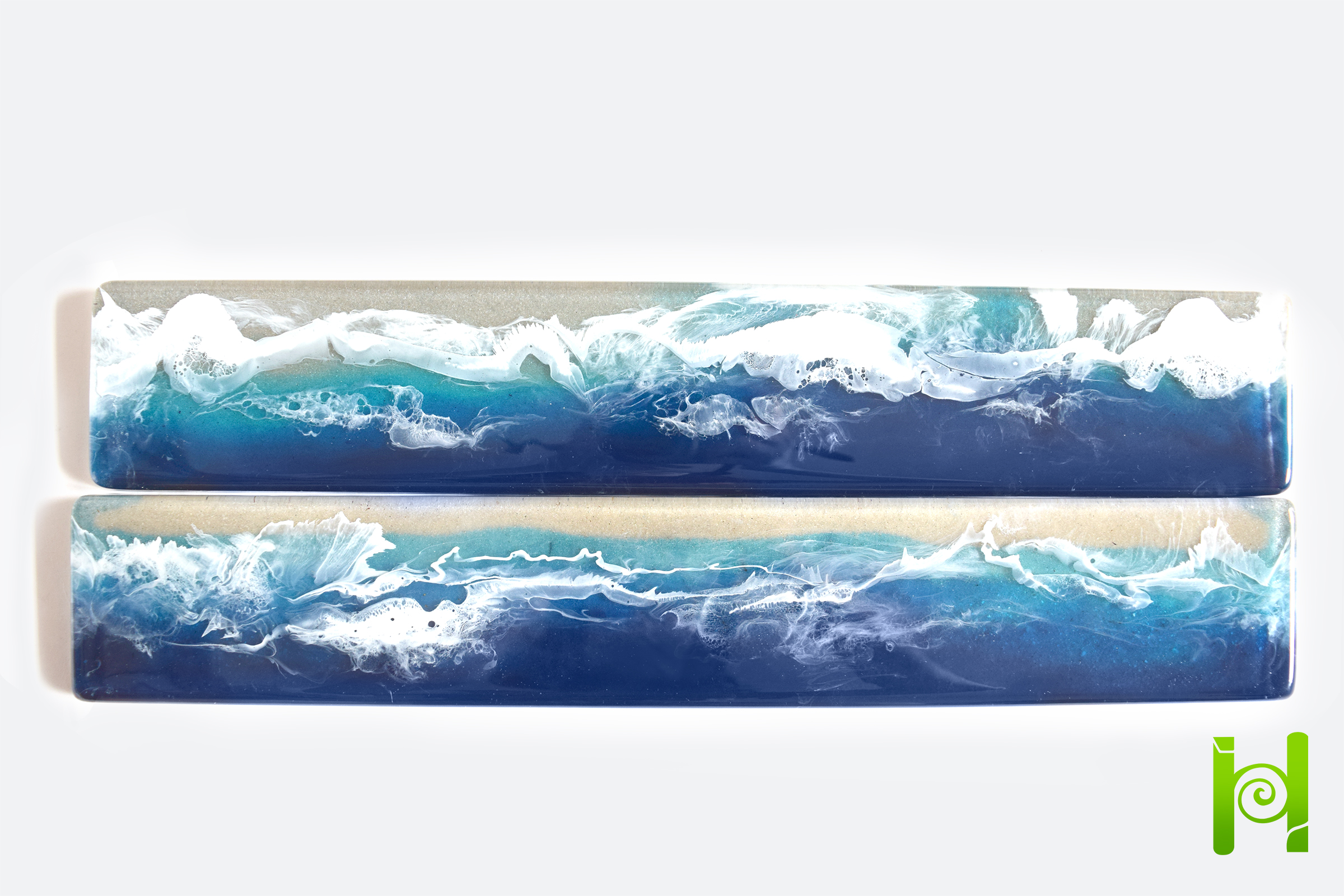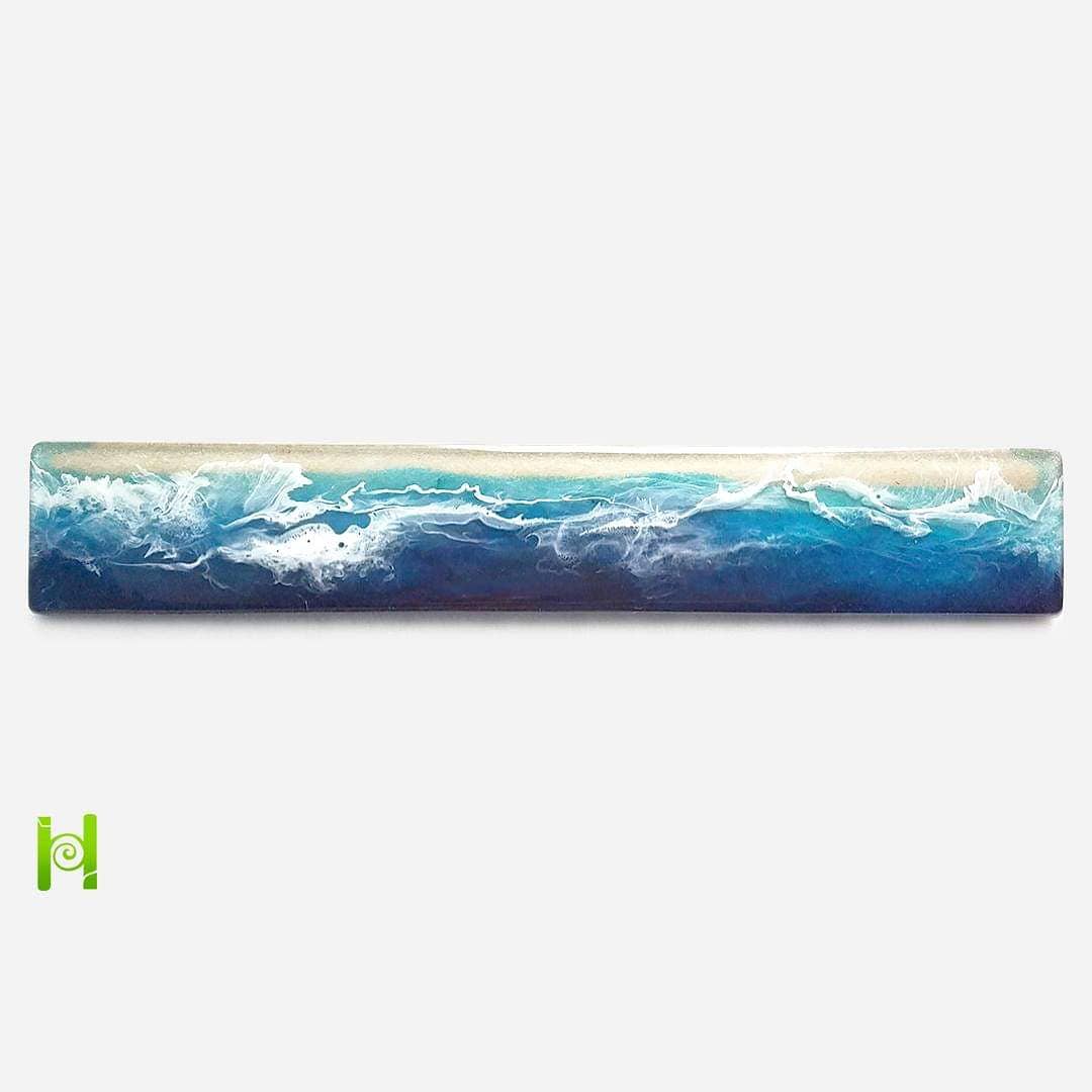 Our enchanting Seaside Wrist Rest is made up of three layers: a layer of clear blue sea water covering a gorgeous layer of smooth untouched white sand, and finished with a transparent layer of resin. Each Wrist Rest is drawn and designed by hand uniquely to guarantee individuality.